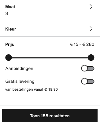 Bij het filteren van bijvoorbeeld producten wordt er vaak een knop getoond om de ingestelde filters daadwerkelijk toe te passen. Hierbij is het handig voor gebruikers als het aantal resultaten dat verschijnt na klikken op de knop in de tekst van de knop gecommuniceerd wordt. Zo weten gebruikers alvast wat ze kunnen verwachten. Misschien willen ze naar aanleiding van het aantal resultaten zelfs eerst nog meer filteren voordat ze de resultaten gaan bekijken.