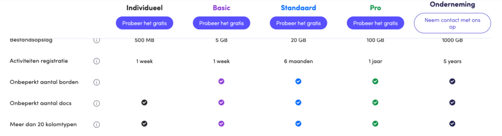 Op de tarieven pagina van Monday zijn de abonnementen eenvoudig te vergelijken dankzij de sticky koppen bij de tabel.
