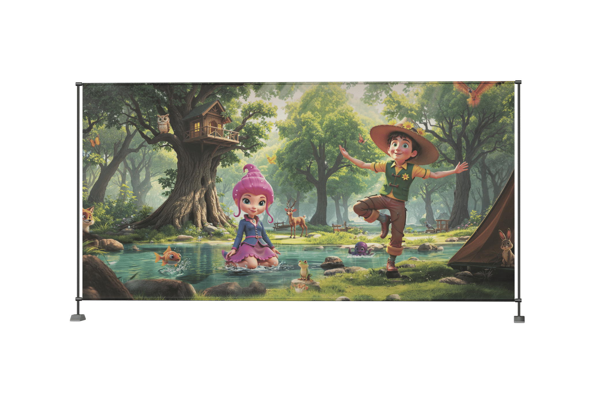 Toen de karakters stonden, breidden we hun wereld uit. Pluck? Die zie je klimmen tussen de bomen, speels en nieuwsgierig. En Pien plonst vrolijk tussen de spetters en fonteinen. Elk karakter kreeg zijn eigen belevingswereld. Volledig met AI gecreëerd.
