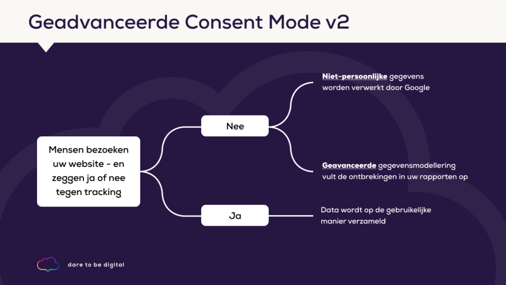 Im Falle des erweiterten Zustimmungsmodus werden bei der Annahme von Cookies die Daten auch auf normale Weise gespeichert und weitergeleitet. Nur wenn Cookies abgelehnt werden, bewirkt der erweiterte Zustimmungsmodus, dass anonyme Pings gesendet werden, mit denen fehlende Daten durch Modellierung ergänzt werden können.