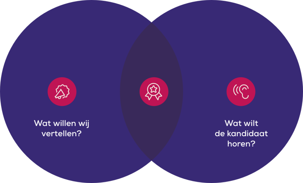 Naast het definiëren van jouw verhaal als werkgever, bekijken we ook naar welke mensen jij graag aan je team zou willen toevoegen. Hoe oud zijn deze mensen? Welke opleiding hebben ze gedaan? Maar vooral: welke karaktereigenschappen moeten deze personen hebben? Om dit in kaart te brengen, stellen wij samen met jou employee persona’s op. Hierin nemen wij onder andere de doelen, frustraties en mediagebruik van de geschikte kandidaat voor jou mee. Zo komen we erachter wat de geschikte kandidaat echt drijft en wat je als werkgever juist niet moet doen. Wanneer we dit in kaart hebben gebracht, kunnen we alle uitingen (denk bijvoorbeeld aan een vacaturetekst, Google Ads-campagne of social post) die volgen hier volledig op afstemmen.