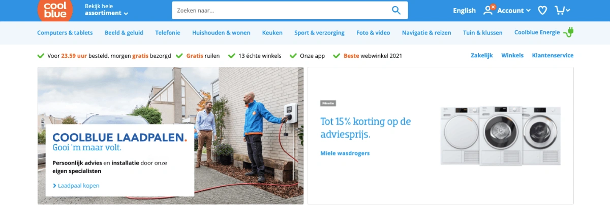 Bij Coolblue is makkelijk te zien dat je op de website van Coolblue zit door het logo linksboven en het blauw en oranje kleurgebruik.